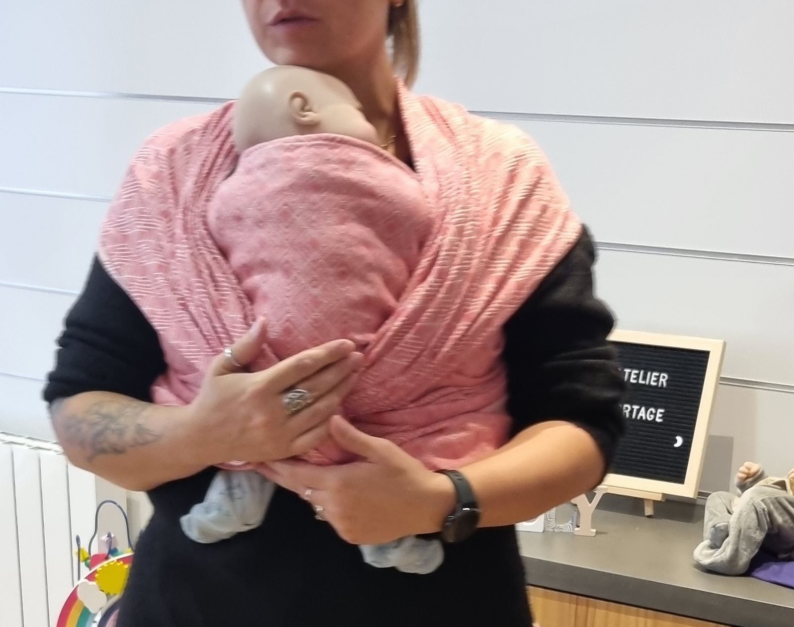 - Apaisement et relaxation profonde : bébé relâche les tensions, retrouve les sensations familières du ventre maternel et se détend totalement.